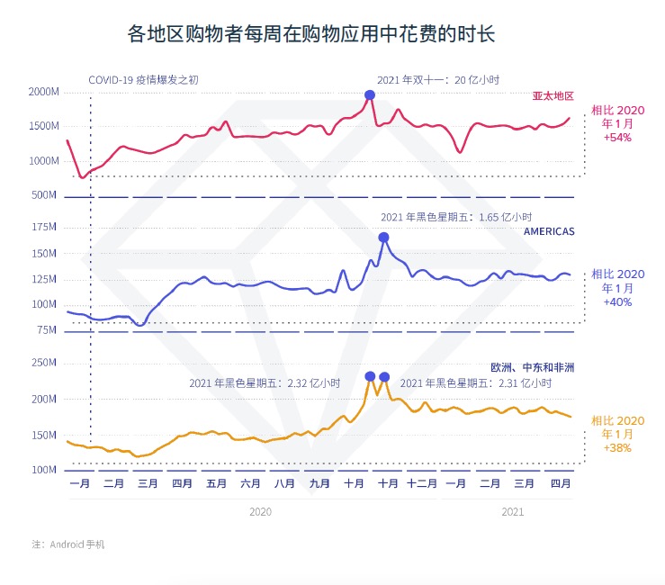 从区域层面来看,到2021 年 5 月,安卓用户均匀每周花在购物运用上的时刻总计为 20 亿小时,相较疫情前添加了 51%。全体上,各区域安卓用户每周运用购物运用的时刻的改变趋势十分类似,但各区域用户运用购物运用时长到达峰值的时刻会不可避免地存在显着的季节性差异,购物运用的用户运用时刻会在区域性购物节时到达顶峰。亚太地区顾客在“双十一”购物节体现微弱,该促销活动由阿里巴巴建议,并被商场上的其他购物运用公司广泛选用。2019 年,阿里巴巴双十一购物节单日产品交易总额(GMV)挨近 400 亿美元,咱们估计,本年的 GMV 总额将会是 2019 年的两倍,大约能够到达 850 亿美元。