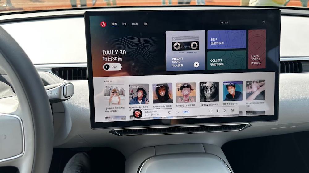 D型运动方向盘也比较契合惯例的操作体会,高频操控功用都集成在了两颗轨迹球上,听音乐/视频时能够播滚轮快进、双击点赞/保藏,长按为“语音”功用,第一次上手习惯完之后就能了解这个功用了。人机交互层面,你能够看到iPhone”灵动岛”的风格,侧划为回来、上划为回到主界面,而且支撑多指触控和多指飞屏操作;在中控屏左边安置了灵动外表,一些要害信息能够内行驶过程中精约出现。
