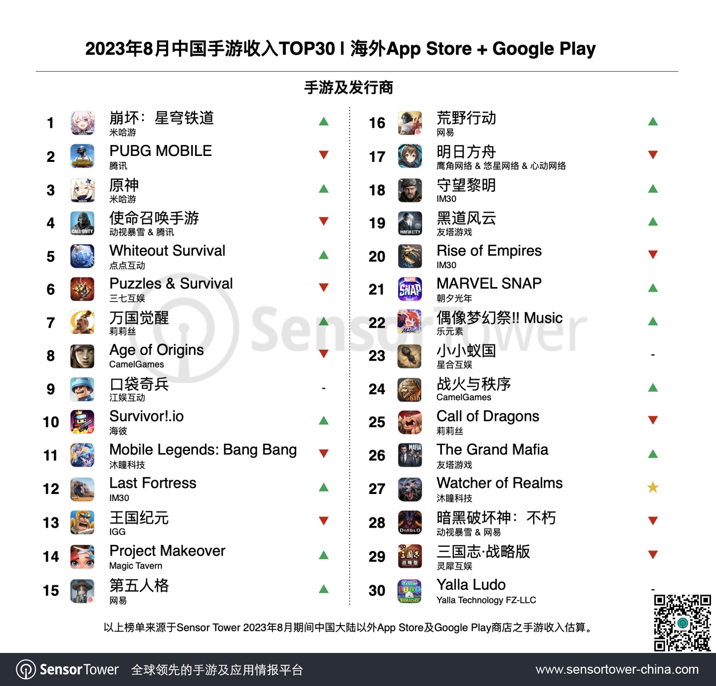 8 月成功出海手游:《崩坏:星穹铁道》重回收入榜和增长榜冠军,圆圈解谜副玩法助力多款游戏收入与下载量大涨