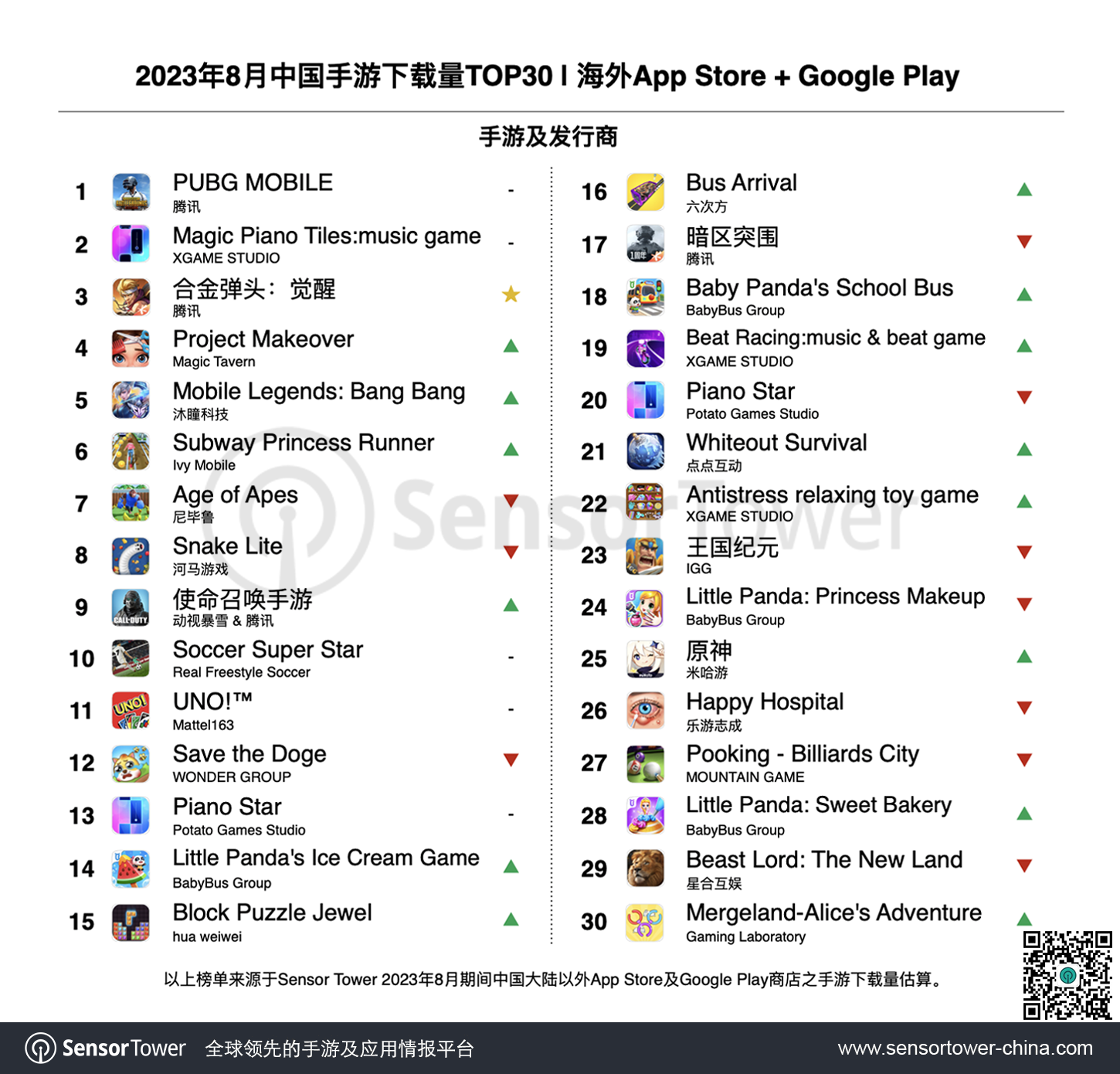 BabyBus Group旗下4款手游《Little Panda’s Ice Cream Game》、《Baby Panda’s School Bus》、《Little Panda: Princess Makeup》和《Little Panda: Sweet Bakery》入围本期下载榜Top30。其间《Little Panda’s Ice Cream Game》海外下载量环比提高35%,排名上升14位至榜单第14名。