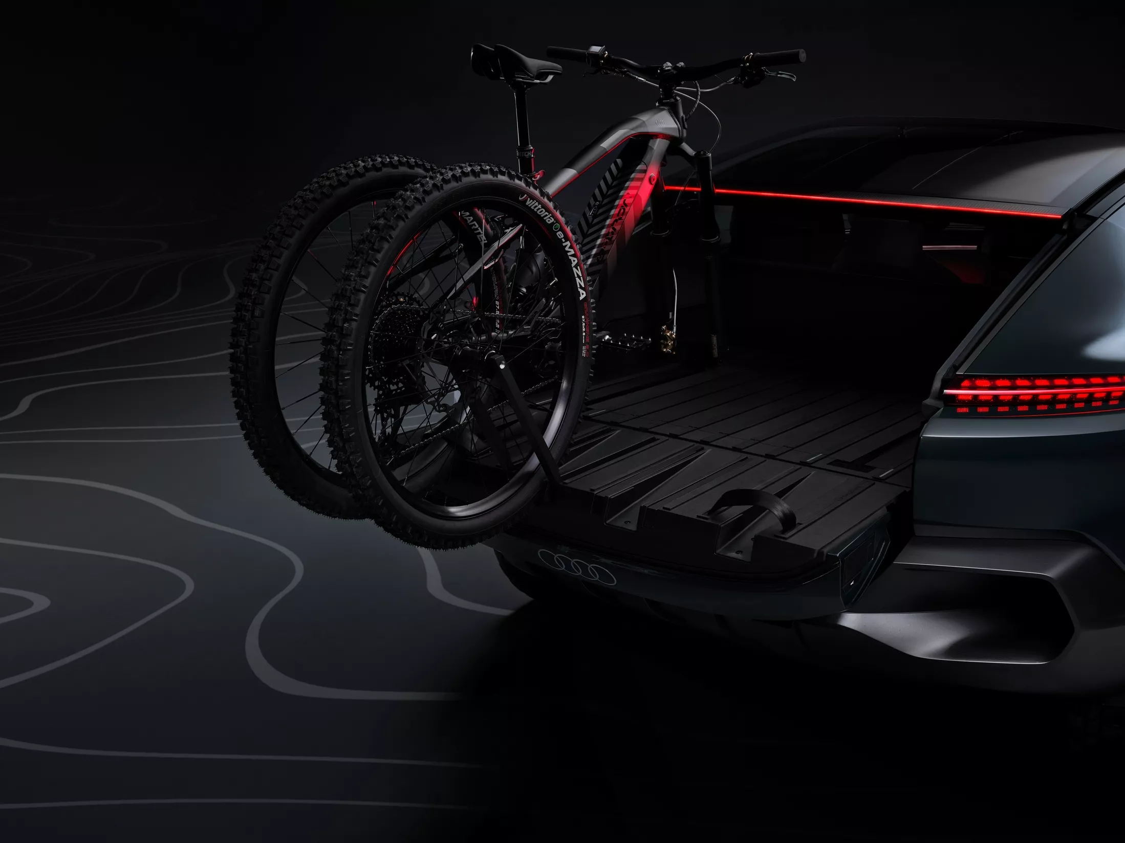 假如需求,通明的后车窗简直能够滑过车顶。一起,后部较低的笔直部分折叠成水平方位。“这拓荒了一个适当不错的装载区,例如,电动自行车车轮的支架现已凹进了,”奥迪是这样描绘这个概念的。趁便说一句,“Pickup”这个词在长篇新闻稿中只用了一次。因为负载区域被 C 柱约束在两边而且向后敞开,奥迪明显更喜爱新词“Activeback”。